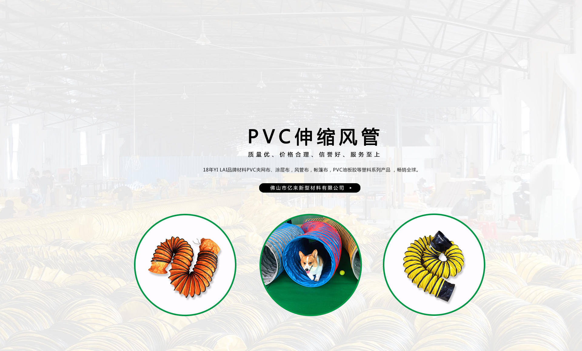 創建“YILAI品牌”近20年來,產品質量穩(wěn)定提高,生產及經營的產品包括PVC夾網布、PVC彩條布、PVC風管布、PVC涂層布、PVC籬笆圍護欄布、PVC透明夾網布、PVC伸縮風管、車縫風管、寵物管、耐高溫風管、地下室通風管,保溫通風管、空調排風管、正負壓通風管、三通/四通排風管、防靜電風管、隧道風管、PVC地板膠等系列產品在市場上得到廣大客戶認可,暢銷歐美、東南亞、非洲、中東等國外市場。